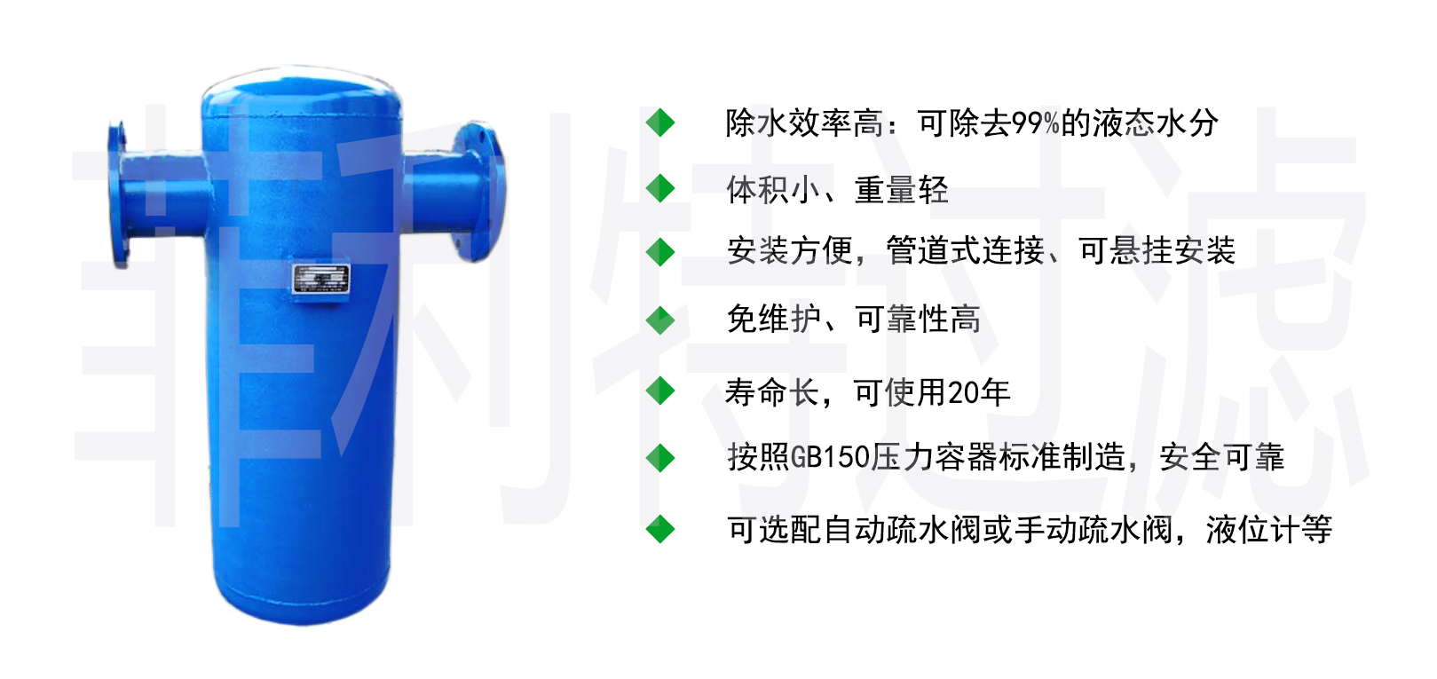 高效分離氣體中的液態(tài)水分,除水效率高達(dá)99%,適用于蒸汽、壓縮空氣、沼氣、天然氣等多種介質(zhì)