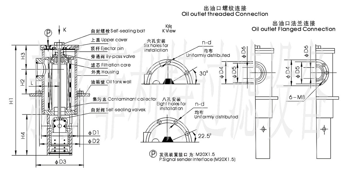 Ø 過(guò)濾器可直接安裝在油箱的側(cè)面、底部和上部,筒體伸入油箱的油液中。出油口設(shè)有螺紋和法蘭連接方式,與油泵吸油口連接,管路簡(jiǎn)單,安裝方便。