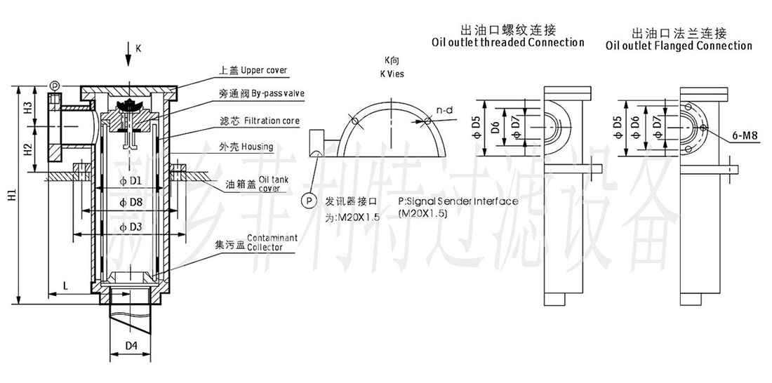 ? 過濾器直接安裝在油箱蓋上,筒體伸入油箱的油液中。出油口設(shè)有螺紋和法蘭兩種連接方式,與油泵吸油口連接,管路簡單,安裝方便。